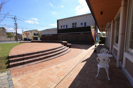 上町まちなか公園と一体に整備された西側の隣地外構。同じ煉瓦が敷き詰められた |