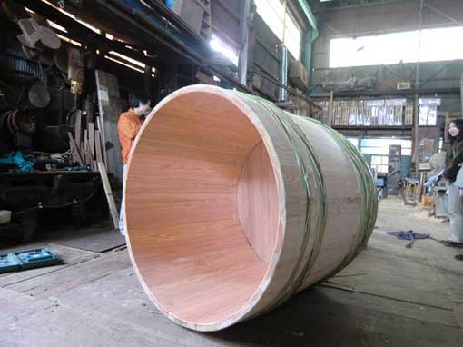 | 樽は尺8・尺5・尺1と規格が決まっていて、樽材については吉野の山であらかじめ規格の板に加工されます。酒が漏らないよう板目が使われ、これを「樽丸」と呼びます。板目取りとは年輪にそった割り方で、年輪が木の芯に向かって曲がろうとする性質を利用し、これを蓋で固定することで本体と蓋が一体化し、容器としての樽が出来上がります。 | |||||||||||||||